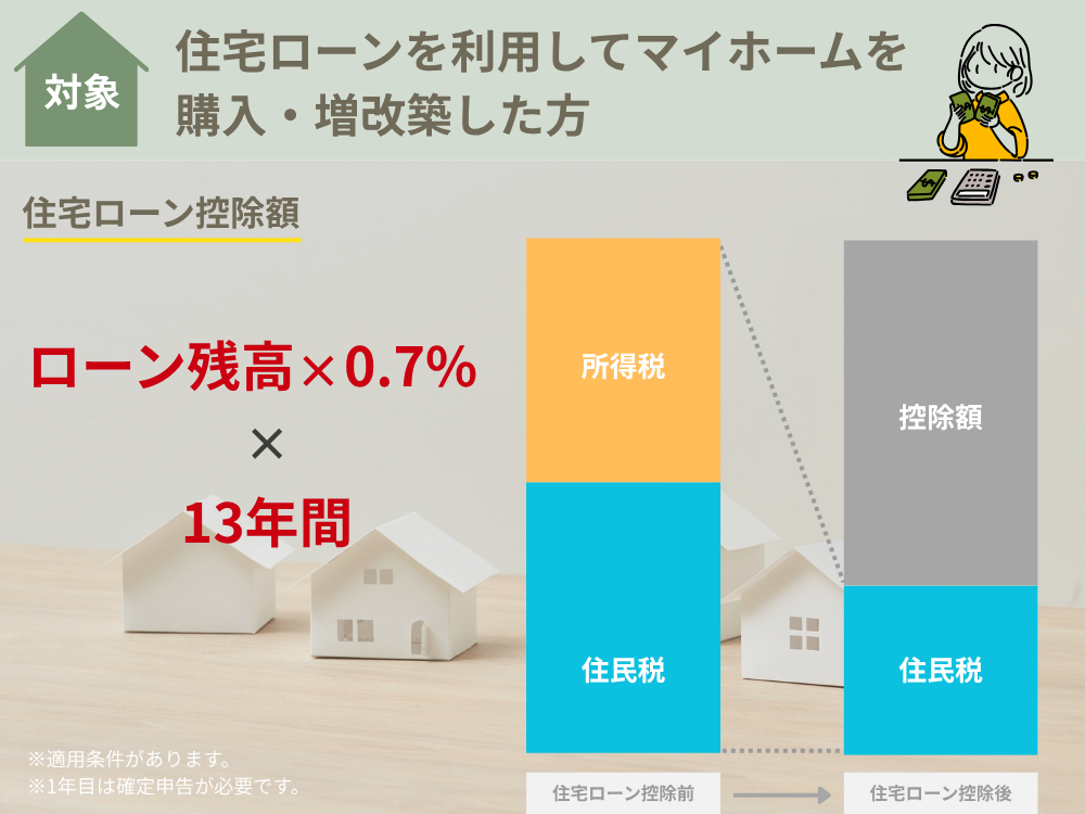 住宅ローンを利用して住まいを購入した場合に、「年末時点での住宅ローンの残高の0.7%」が、入居した年から最長13年間にわたって、所得税や住民税から控除される制度のことです。