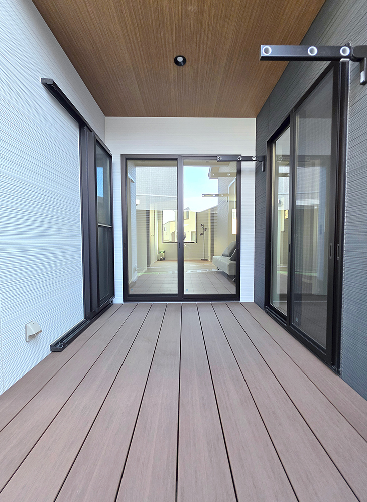 ②リビングと中庭を繋ぐ「ウッドデッキ」