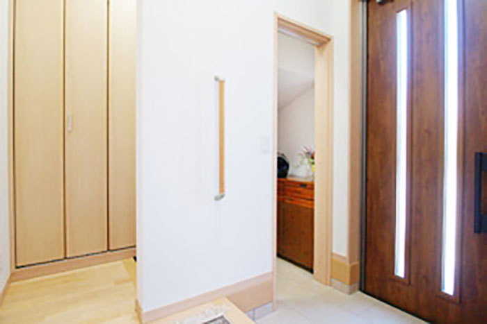 玄関横のプライベート玄関が便利です。突然のお客様でも安心です。広々としたオープンキッチンも快適です。それと何と言っても「太陽光発電」にしたことで電気代が掛かりません。