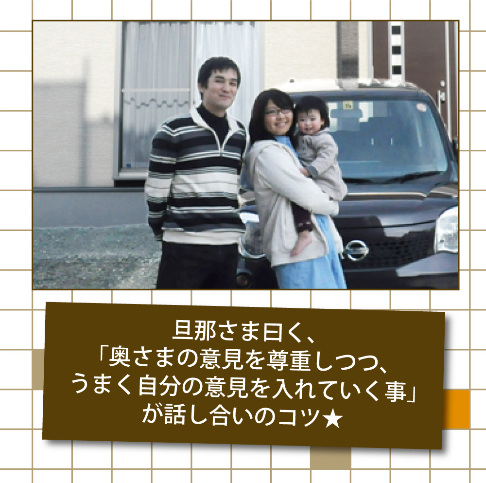前回の打合せでお願いした事を忘れた時も、「忘れました!」と正直に謝ってくれたりするところも好感が持てましたね。現場監督の熊本さんも、言った事はちゃんとやってくれましたし、まじめに建ててくれました!!