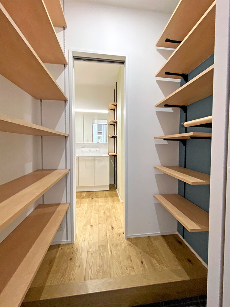 シューズラック、ウォークインクローゼットです。手洗い場まで小学生の子どもが周りを汚すこと無く脱衣場まで行けます。