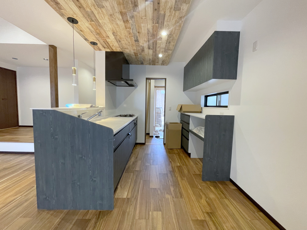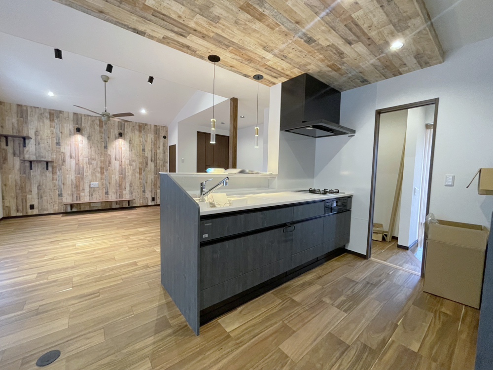 ダイニングキッチンに折り下げ天井を取りれると、空間にメリハリがつき、落ち着きや広がりを感じられる効果があります。