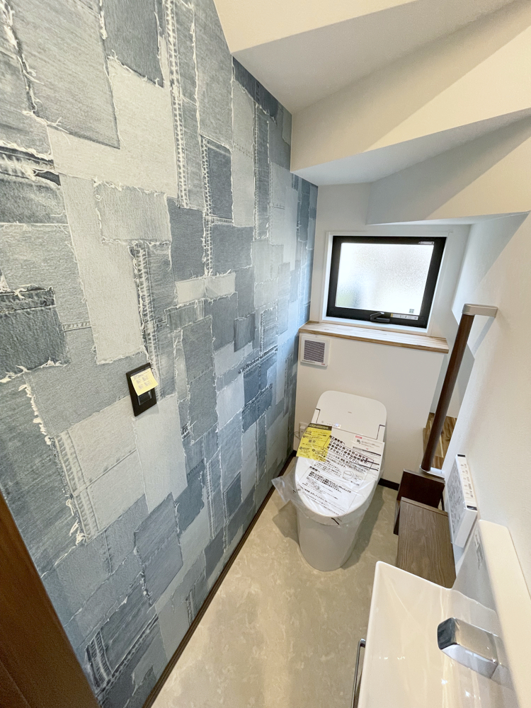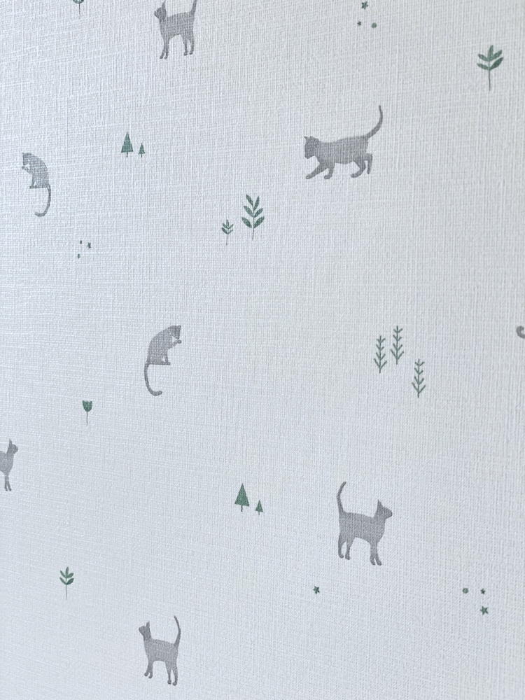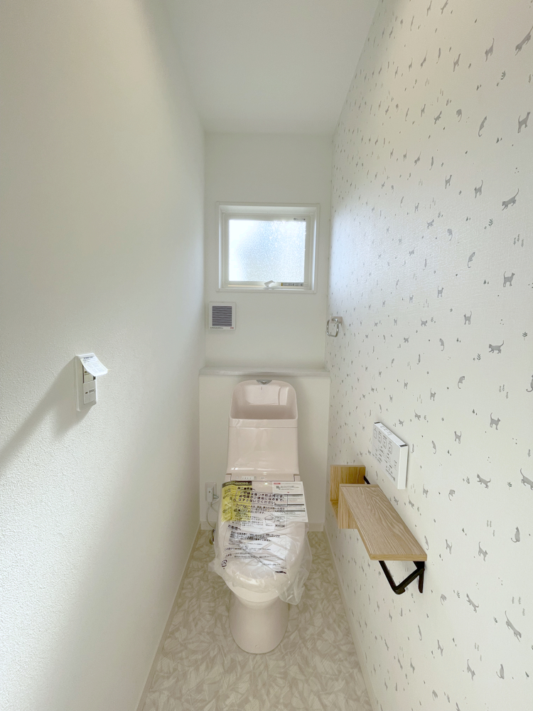 猫ちゃんのイラストが可愛いデザインの壁紙をセレクトした2階のプライベートなトイレ。