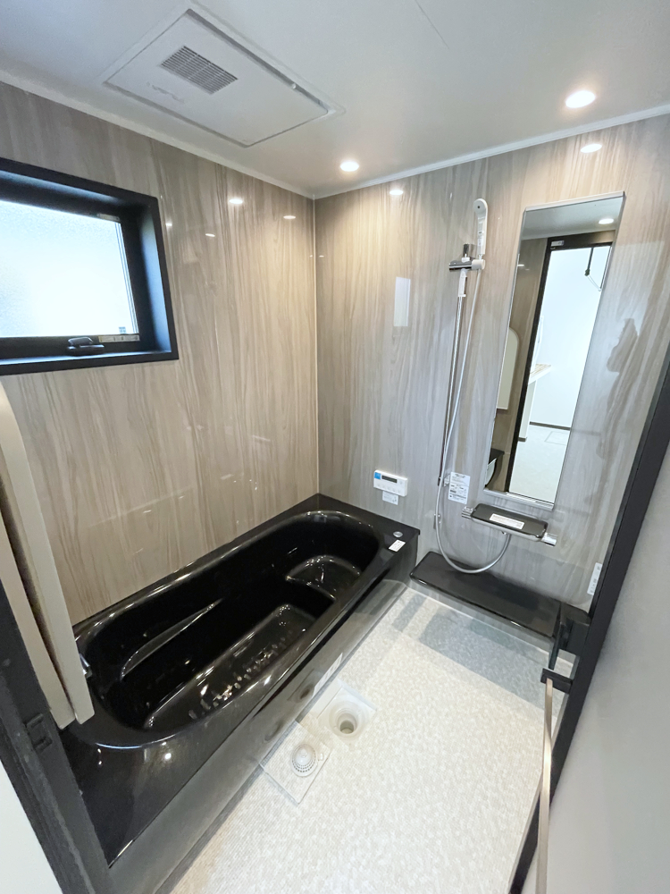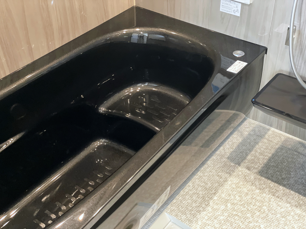 ぐるーっと鏡面仕上がりに自然な風合いを活かした木目柄グレイッシュウォルナットに、ジュエリーブラックの人大浴槽で高級感のある仕上がりになりました。