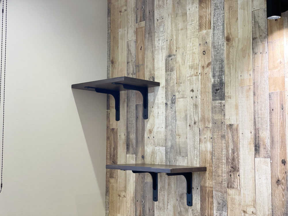 ブラックデニムの記事を重ねたモダンカジュアルなクロスは素材感が出た個性的な存在感を出しています。また、インテリアの一部のようなブラックが引き締まったアイアンバーや棚などもスッキリとした印象です。