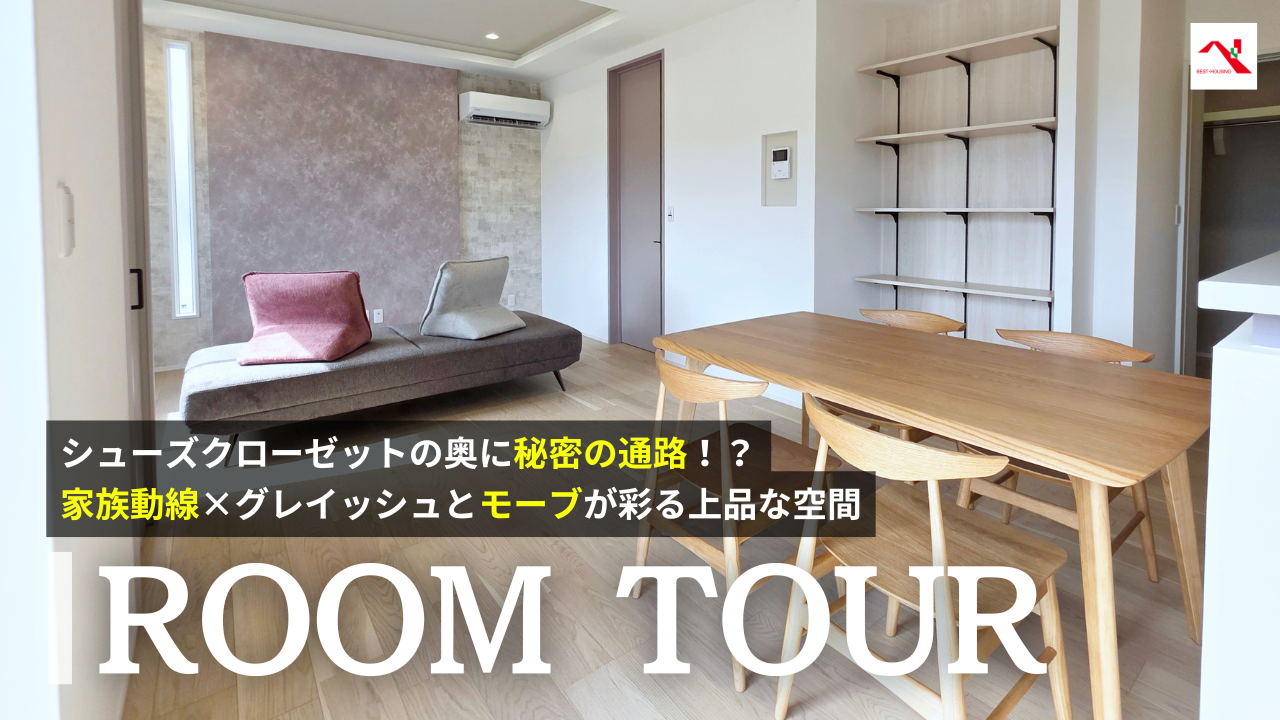 【ルームツアー/間取り付き】シューズクローゼットの奥に秘密の通路!?家族動線×グレイッシュとモーブが彩る上品な空間|浜松市中央区三方原町21期