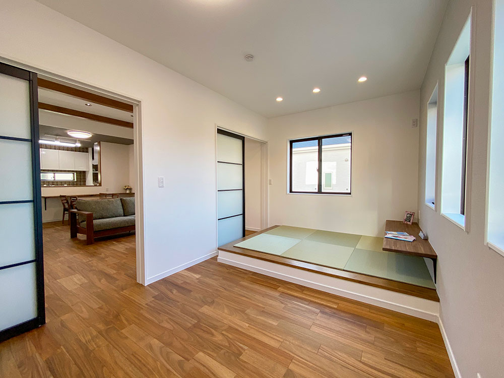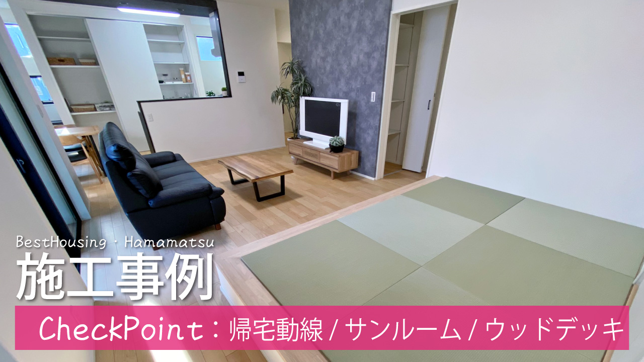 【建築実例】行き止まりのないストレスフリー住宅 | 和コーナー+洋室の部屋 | ウッドデッキとサンルームが繋がっているお家